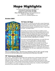 Hope will be celebrating 75 years with a special worship service at 9:30 AM followed by a catered lunch on Sunday, July 19, 2026. Please plan to attend this joyous celebration! More information will be forthcoming.